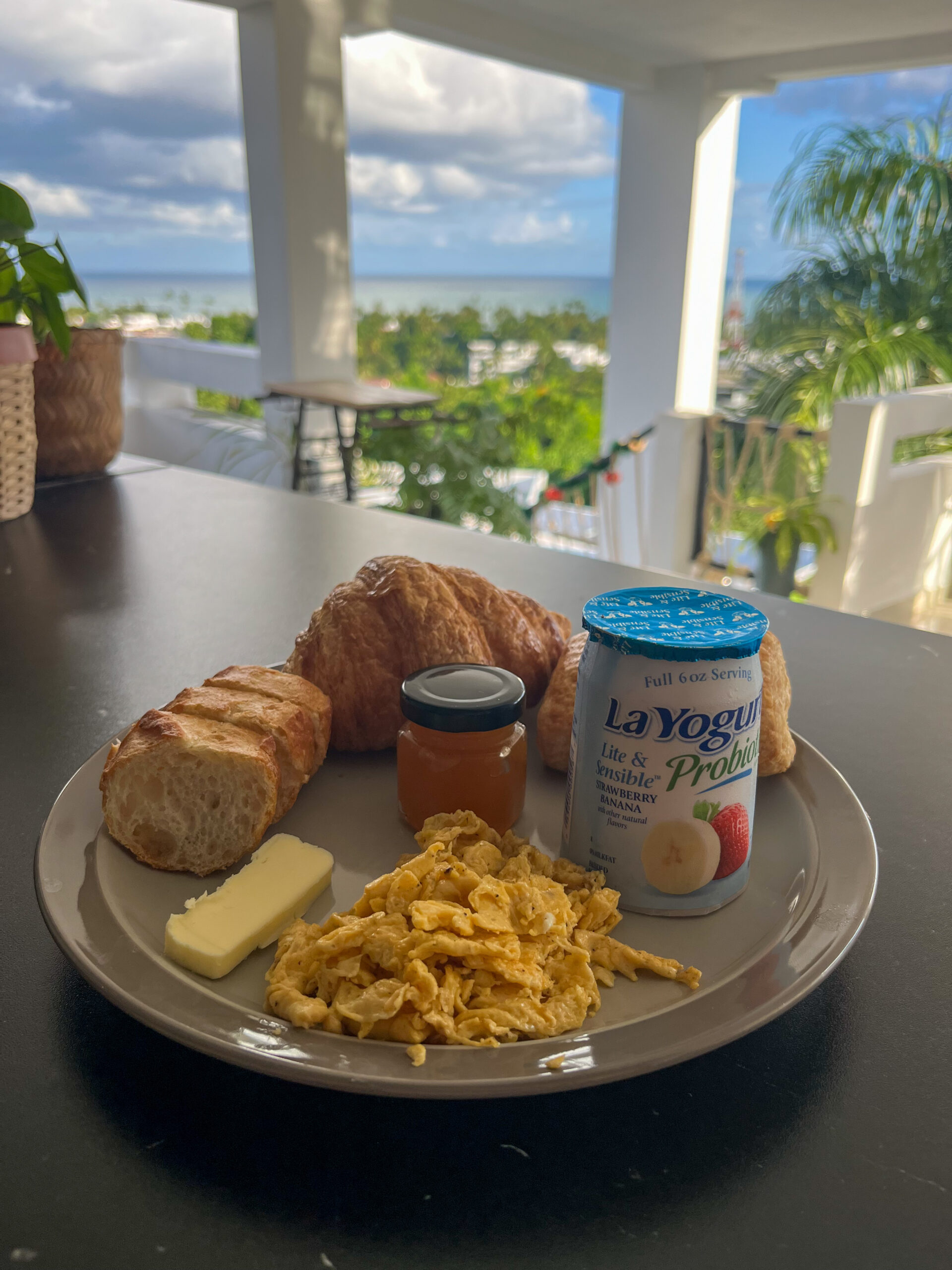 With croissant, chocolate croissant, butter and jam, baguette, yogurt and scrambled eggs.