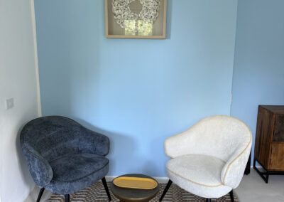 Our spacious suite features an area with two armchairs, a desk, and a storage area. From your window, enjoy the view of the forest.