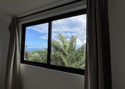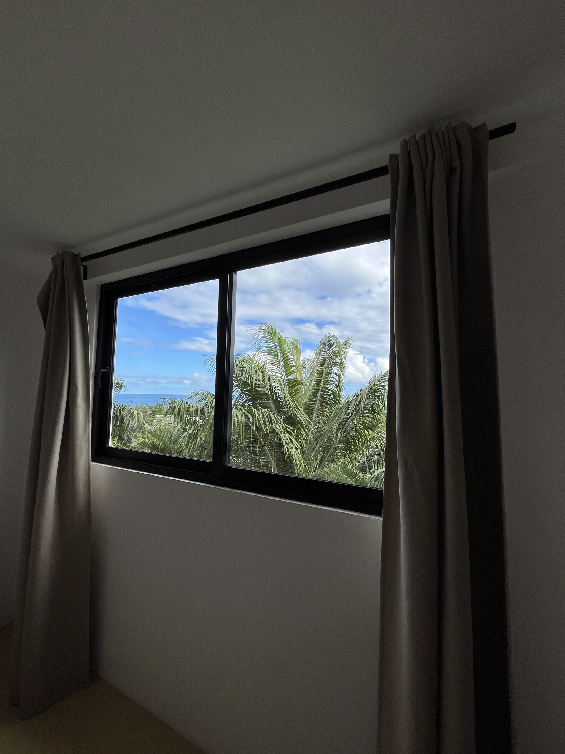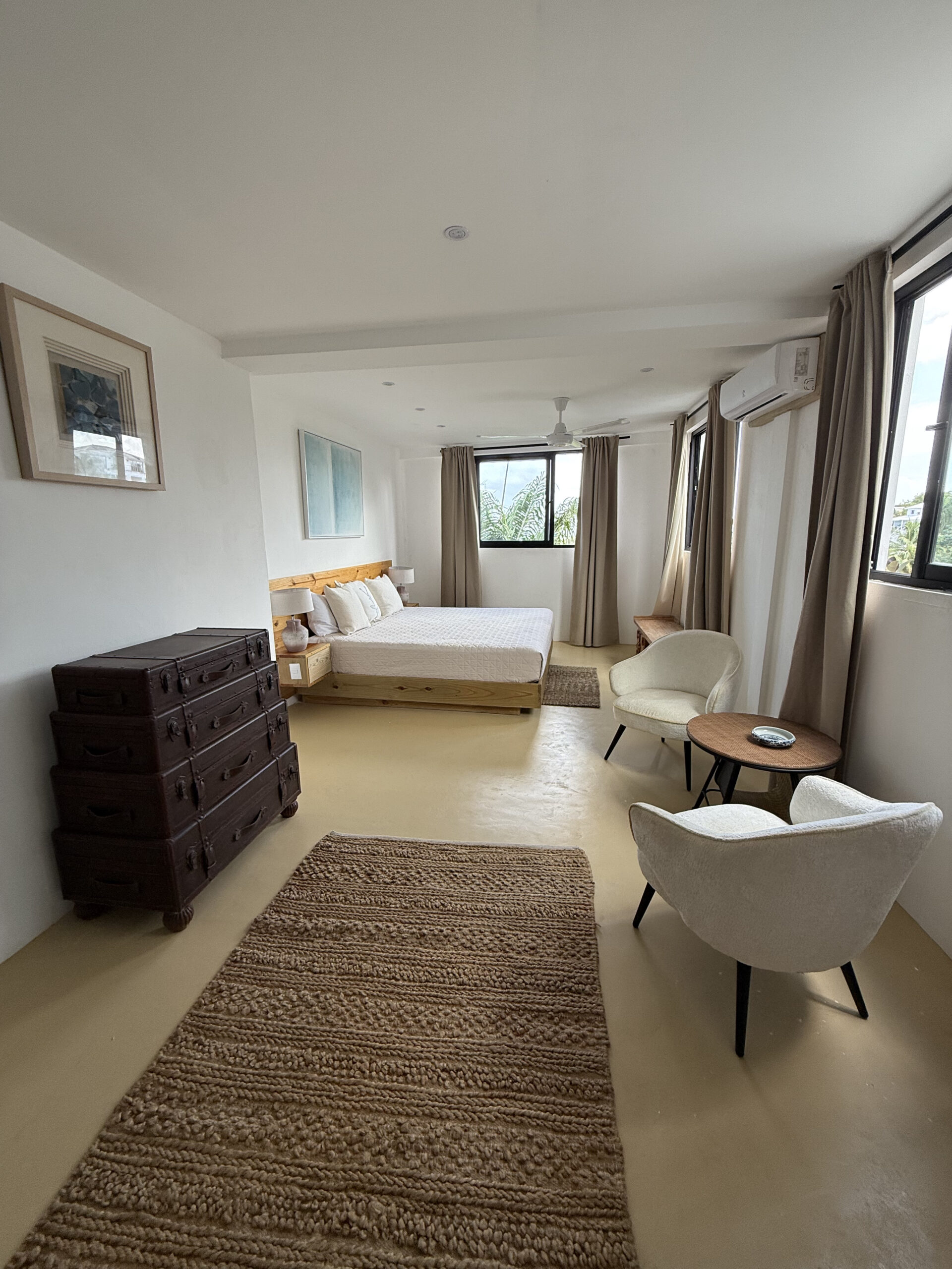 Our room features a spacious seating area with two armchairs, a window overlooking the ocean.