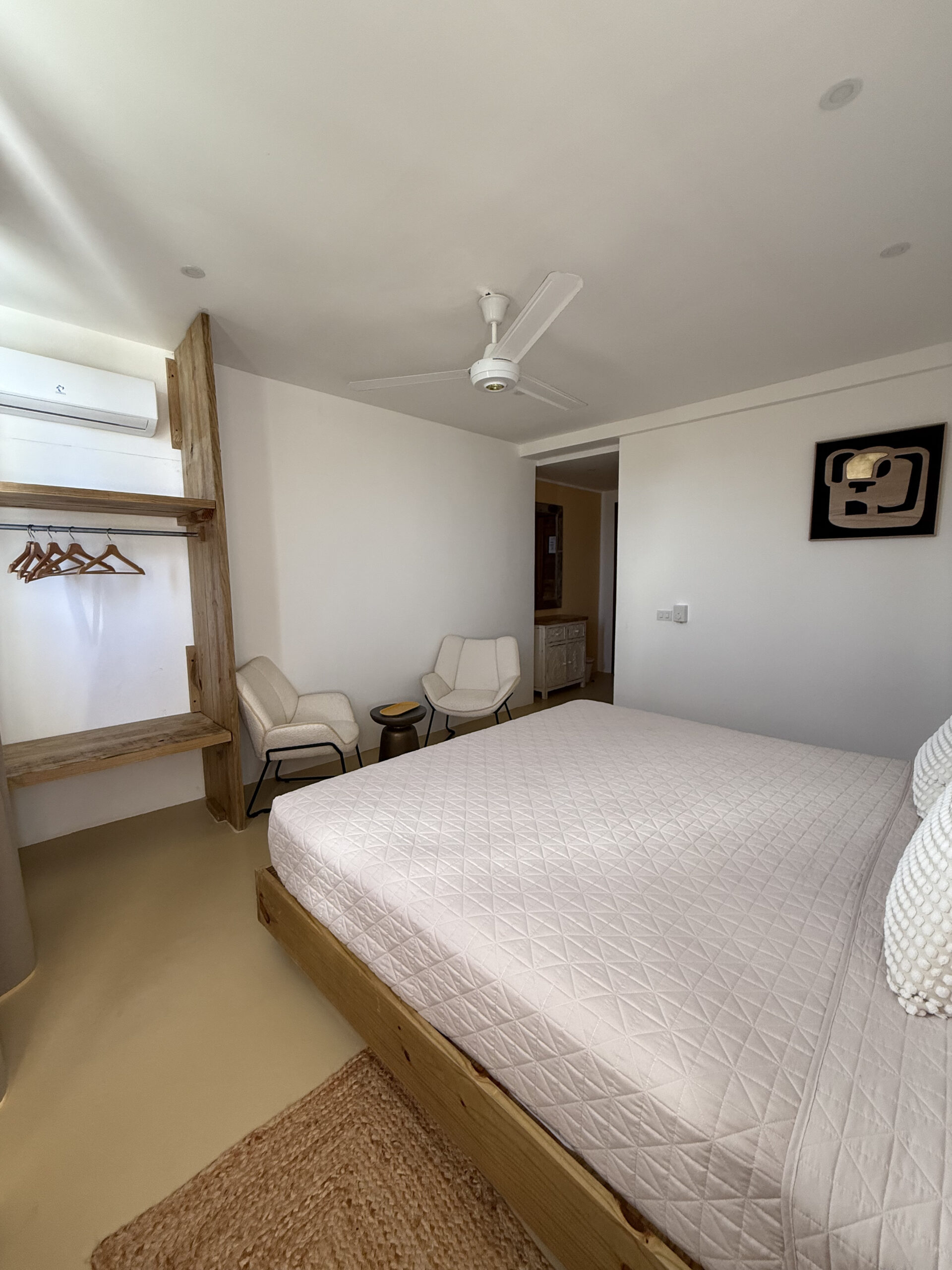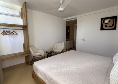 This room includes air conditioning, a king-sized bed, a storage area and a modern private bathroom.