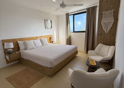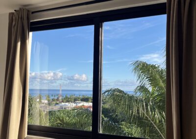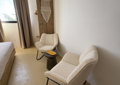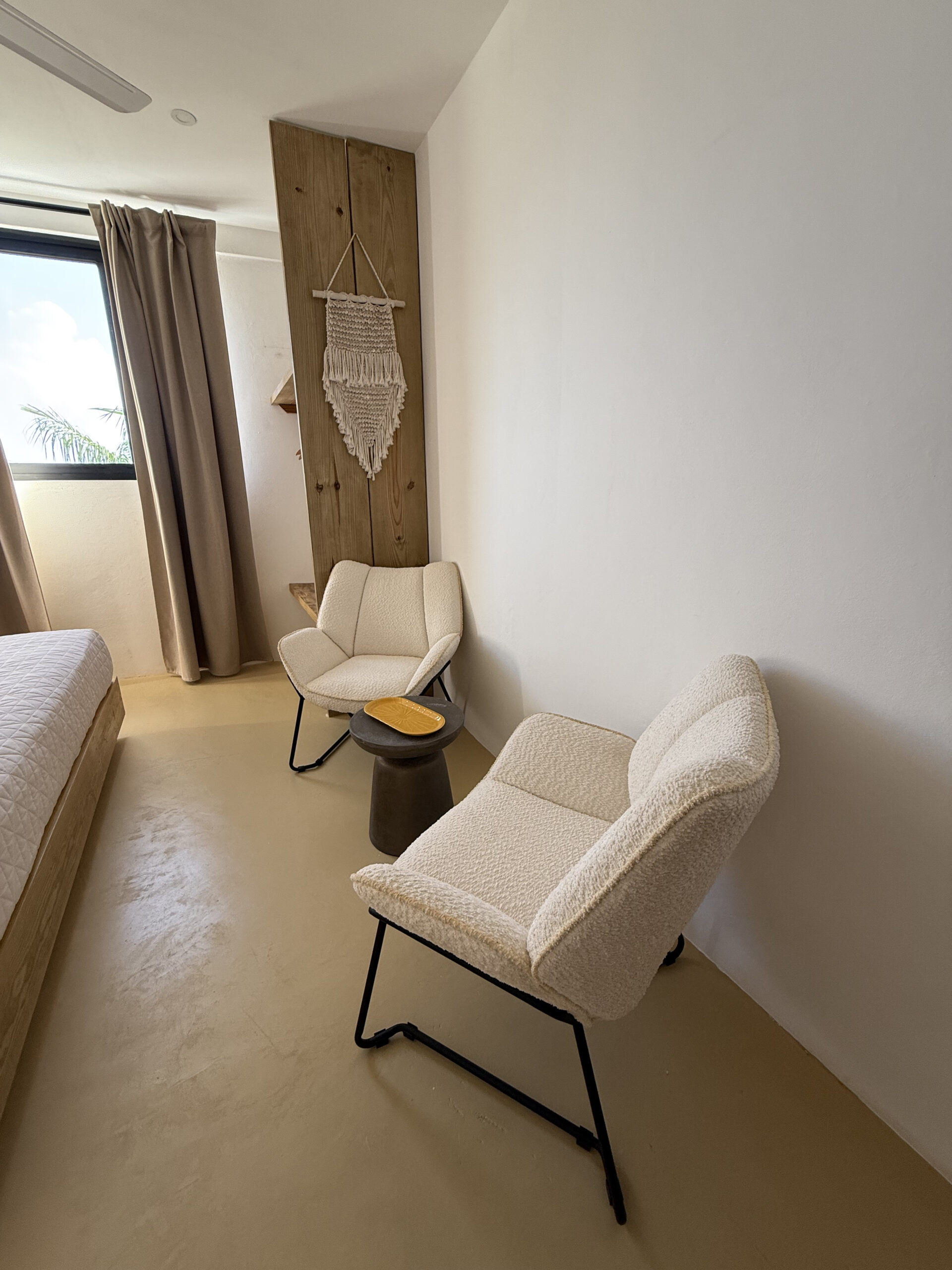 Our room features a seating area with two armchairs and a window overlooking the ocean.